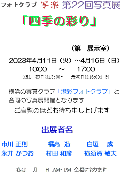 フォトクラブ「写楽」第22回写真展『四季の彩り』開催をお知らせします