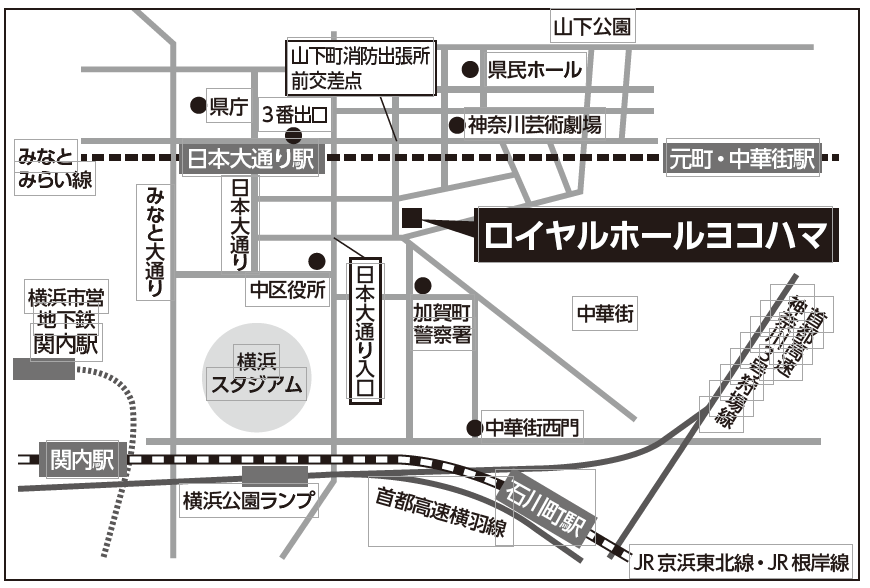 アクセス :みなとみらい線・日本大通り駅、JR・関内駅 石川町駅、横浜市営地下鉄:関内駅からそれぞれ徒歩